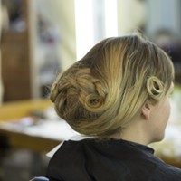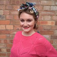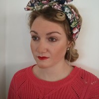 Own hair, curled and pinned into place. Face made slightly bronzed to reflect work in the fields. Based on contemporary images of Land Girls.