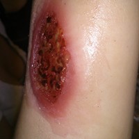 Coloured gelatine made from my own mould. Shaded to give depth and filled with blood and puss.
