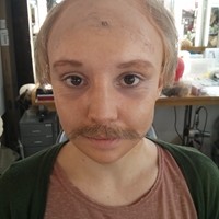 Created a bald cap, coloured and blended to match subjects skin colour. Used a wig and moustache along with shading of nose and jaw to attempt to change gender and shaded around the eyes and mouth, typically where lines form to create the aging.