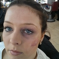 Greasepaint used to create black eye and bruised cheek.