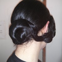 3/4 wig with other wefts and swatches fed into wig to create goddess like hair, coloured ribbon and a top bun made of plaits forms the characteristics associated with Kwan Yin.