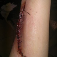Coloured gelatin from my own mould, shaded do give depth, blended edges with witch hazel. Thick thread used to create stitched effect, inside of wound shaded to give effect of dry, crisp skin.