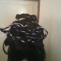 3/4 wig with other wefts and swatches fed into wig to create goddess like hair, coloured ribbon and a top bun made of plaits forms the characteristics associated with Kwan Yin.