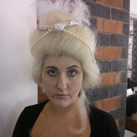 Based on a portrait. Yak wig styled and accessorized, defined eyebrows and masked a spot by concealing it and colouring black. Very pale base, white grease paint used to create a very pale colour with translucent powder.